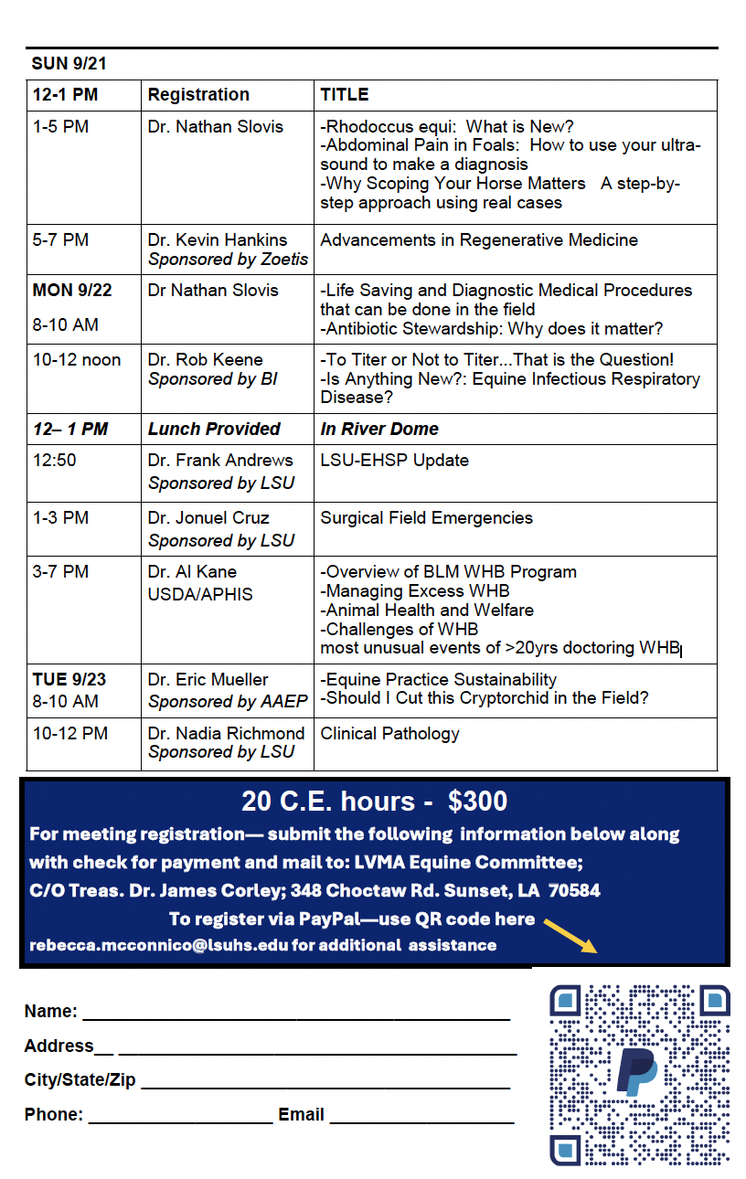 You are invited to the Peter Haynes Memorial Lectures (aka. LVMA Equine Meeting), Sept. 18-22, 2022 at the Horse Shoe Casino in Bossier City. Please note STUDENT NIGHT on Sunday, Sept. 18, 2022. All undergraduate pre-vet students and veterinary students (and mentors) are invited for a discussion of “Careers in the Equine & Large Animal Health Field”.