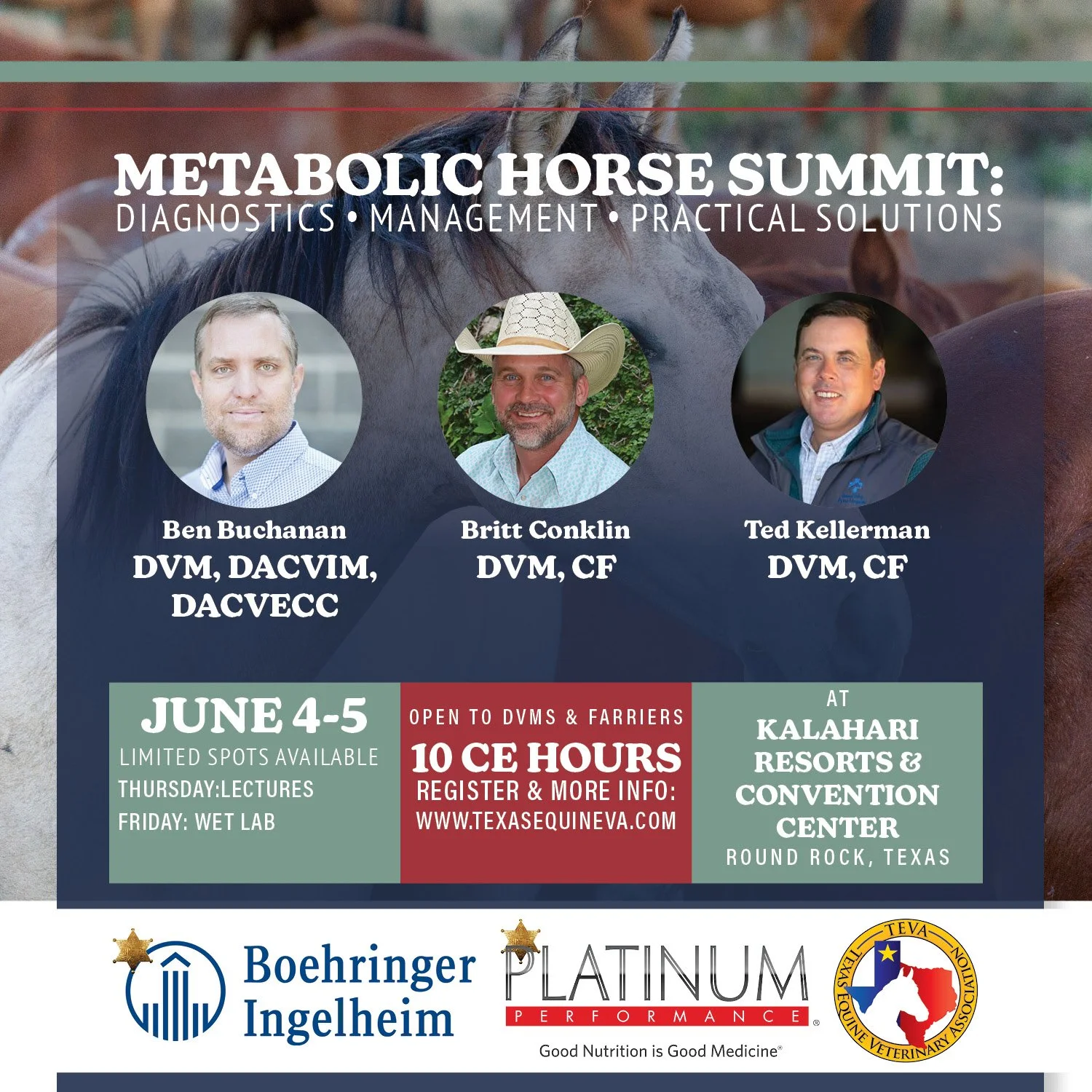 Metabolic Horse Summit Thursday, June 4, 2026 8:00 AM Friday, June 5, 2026 12:00 PM Kalahari Resorts & Convention Center 3001 Kalahari Boulevard Round Rock, TX, 78665 United States (map) Google Calendar ICS Boutique Meeting Registration $475.00 Purchase Book Your Room Here