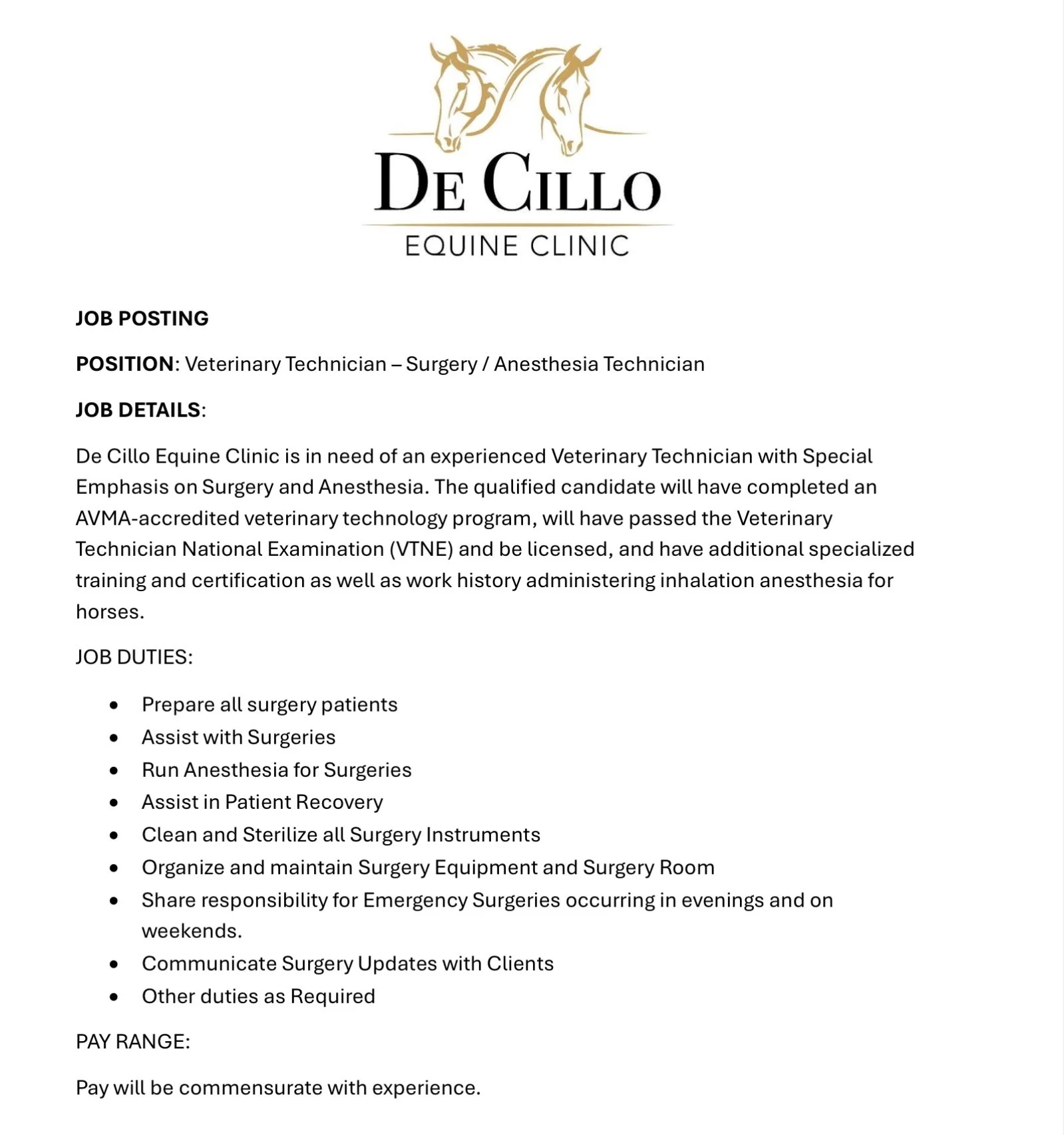 De Cillo Equine, a full service equine only practice, is seeking an associate veterinarian to join our team. Both in clinic and mobile, we offer all aspects of veterinary care, from routine health/wellness and teeth floating to more extensive lameness evaluations, pre-purchase exams, surgeries and reproduction services. Our clientele are very diversified; from Polo to Dressage, Hunter Jumpers to Western Performance horses, as well as those used for family pleasure riding.